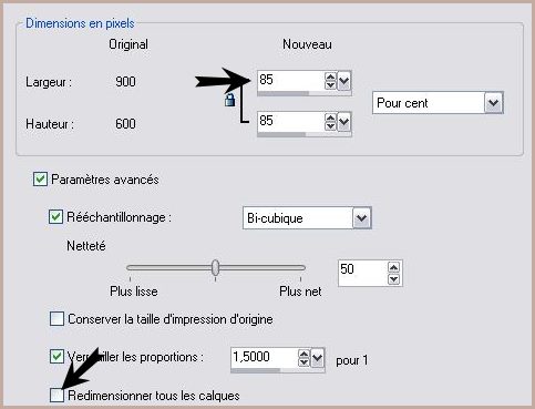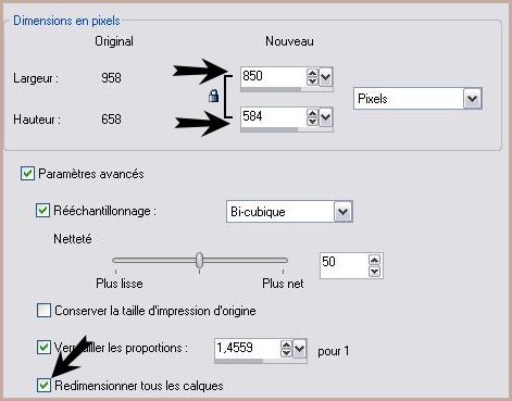 93 - Répéter avec des valeurs négatives : -3 en décalage vertical et horizontal 94 - Sélection/Désélectionner 95 - Image/Ajouter des bordures : 1 pixel couleur #000000 96 - Image/Redimensionner à 850 x 584 pixels/cocher " tous les calques"