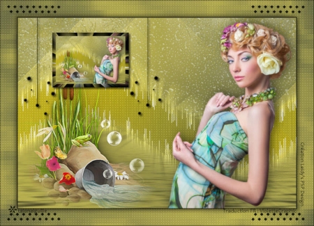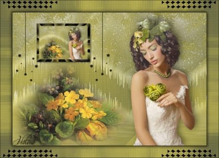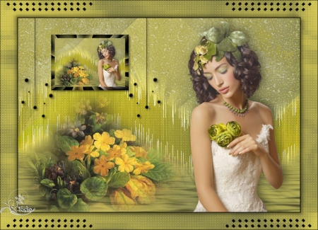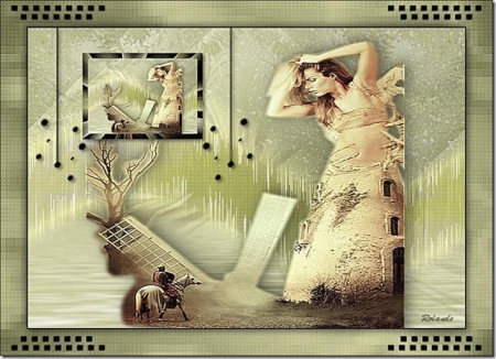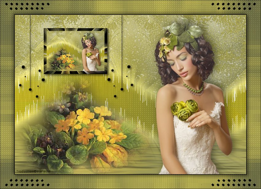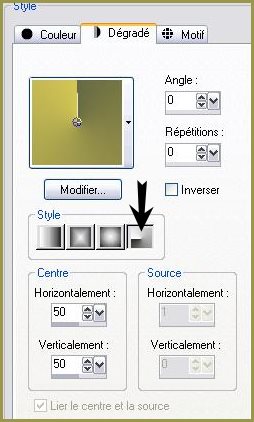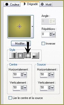 *** 1 - Ouvrir une image de 800 x 550 pixels 2 - Placer en avant-plan la couleur #686a43 3 - En arrière-plan la couleur #d4c754 4 - Configurer en avant-plan un dégradé radial angle: 0°/Répétition: 0