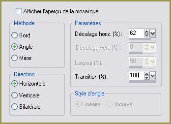 5 - Remplir votre image avec le dégradé 6 - Réglages/Flou/Flou gaussien : rayon : 100 7 - Couches/Dupliquer 8 - Effets/Simple/Diamonds 9 - Effets/Effets d'image/Mosaïque sans jointures: