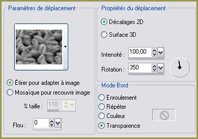 14 - Sélection/Transformer la sélection en calque15 - Sélections/Désélectionner 16 - Effets/Effets de distorsion/Paramètres de Déplacement: rechercher la texture épicéa bleu ( Corel_15_031 )