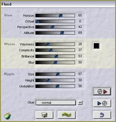 40 - Calques/Agencer/Déplacer vers le bas 41 - Dans la Palette des calques, placer en Mode calque : Eclaircir / Opacité à 40% Si vous avez choisi d'autres couleurs choisir le mode de calque : recouvrement ou autre selon votre choix 42 - Activer la couche inférieure 43 - Effets/Flaming Pear/Flood avec les réglages ci-dessous: