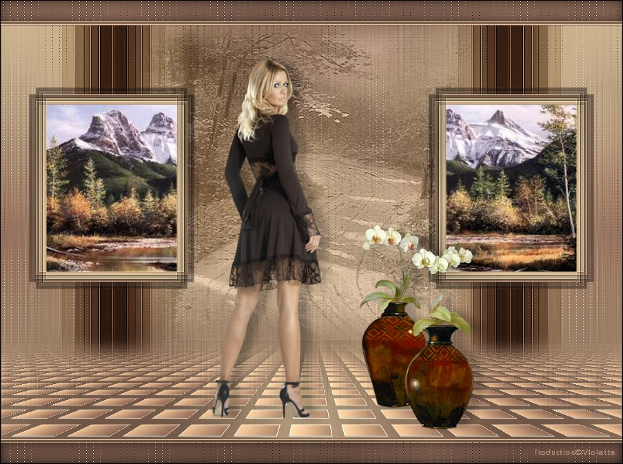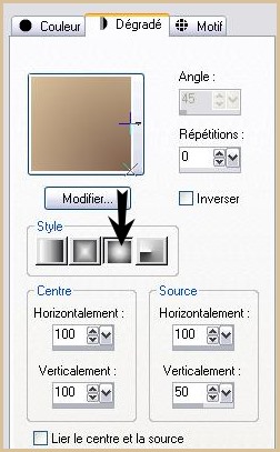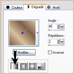 *** 1 - Ouvrir une image de 900 x 600 pixels 2 - Placer en avant-plan la couleur #7d5e4d 3 - En arrière-plan la couleur #d8c09a 4 - Configurer en avant-plan un dégradé linéaire angle: 45°/Répétitions: 2