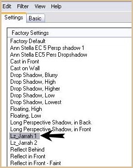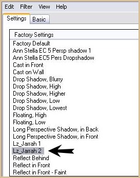 41 - Effets/Alien Skin Eye Impact 5/Perspective Shadow Onglet settings: rechercher le preset Lz jarrah 1 / OK