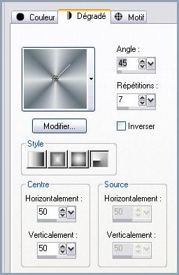 Placer chaque étoile sur un calque afin de modifier la taille et l'intensité de l'éclairage 71 - Calques/Fusionner Tout 72 - Image/Ajouter des bordures : 1 pixel couleur #f5f5f5 73 - Placer en avant-plan la couleur #66737b 74 - Placer en arrière-plan la couleur #dce0e1. 75 - Configurer un dégradé radial angle: 45°/Répétitions: 7