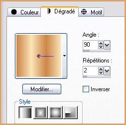 1 - Ouvrir une image de 700 x 500 pixels 2 - Placer en avant-plan la couleur #d58d40 3 - En arrière-plan la couleur #fae5b8 4 - Configurer un dégradé linéaire angle: 90°/Répétitions: 2/Inverser coché