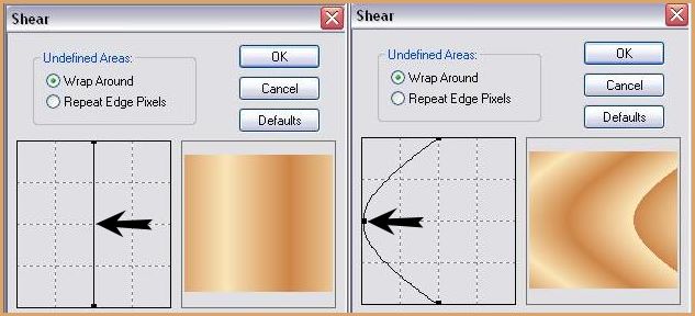 ![]() 5 - Remplir avec le gradient 6 - Effets/Filtre Distort/Shear : clic au milieu du trait vertical et emmener à gauche