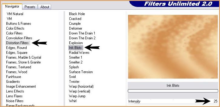 7 - Réglages/Flou/Flou gaussien : rayon : 25 8 - Effets/Unlimited/DistorsionFilter/Ink Blots :