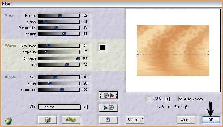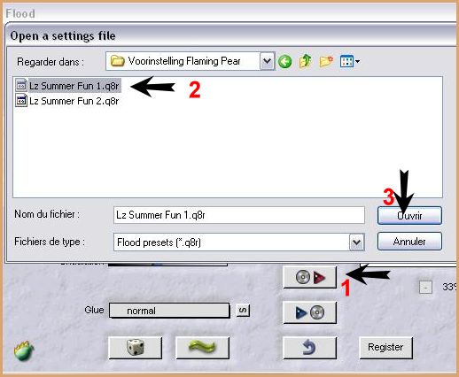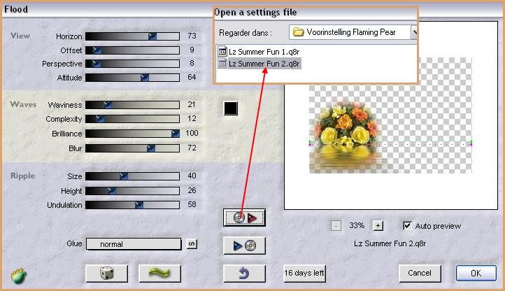 9 - Effets/Filtre Flaming Pear/Flood : Ouvrir votre filtre et aller chercher le preset Lz Summer Fun 1.q8r contenu dans votre dossier de fournitures