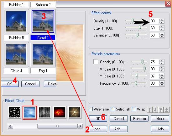 Placer le calque en Mode de calque : Eclaircir Sur le même calque: 18 - Sélection/Charger/Enregistrer une sélection/charger à partir du disque/Charger la sélection Tz Summer Fun 2 19 - Appuyer sur la touche "Suppr" 20 - Sélection/Désélectionner 21 - Effets/Effets de bords/Accentuer 22 - Calques/Fusionner les calques visibles 23 - Calques/Dupliquer 24 - Effets/Ulead Particle Suivre le chemin indiqué : clic sur "Load" , sélectionner Cloud 1 et ensuite changer la densité