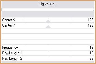 Mode calque : Recouvrement Si vous avez choisi d'autres couleurs adapter le mode de calque 51 - Calques/Fusionner Tout 52 - Image/Ajouter des bordures : 1 pixel couleur #874d1f53 - Image/Ajouter des bordures : 3 pixels couleur #fae5b8 54 - Image/Ajouter des bordures : 1 pixel couleur #874d1f 55 - Sélection/Sélectionner Tout 56 - Image/Ajouter des bordures : 40 pixels couleur #d9d6e9 57 - Sélection/Inverser 58 - Effets/VM Natural/Lightburst avec ces réglages :