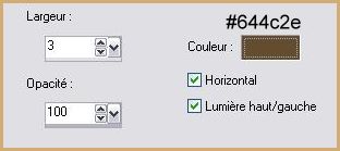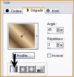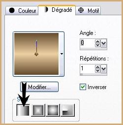 *** 1 - Ouvrir une image de 700 x 500 pixels 2 - Placer en avant-plan la couleur #ebcea1 3 - En arrière-plan la couleur #644c2e 4 - Configurer un dégradé linéaire angle: 0°/Répétition: 1/Inverser coché