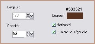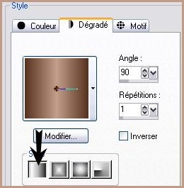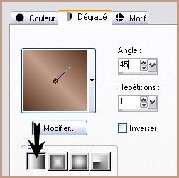 *** 1 - Ouvrir une image de 700 x 500 pixels 2 - Placer en avant-plan la couleur #583321 3 - En arrière-plan la couleur #c39e8a 4 - Configurer un dégradé linéaire angle: 90°/Répétition: 1/Inverser coché