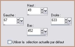 45 - Avec la baguette magique sélectionner les lignes transparentes 46 - Placer un motif or en avant-plan / Remplir votre sélection 47 - Sélections/Désélectionner 48 - Calques/NOUVEAU CALQUE 49 - Activer l'outil sélection/clic sur Sélection Personnalisée/Placer ces chiffres :