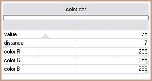 14 - Remplir de motif or 15 - Sélection/modifier/Contracter de 1 pixel 16 - Remplir de couleur #583321 17 - Sélection/modifier/Contracter de 5 pixels 18 - Remplir de motif or 19 - Sélection/modifier/Contracter de 1 pixel 20 - Remplir du dégradé initial 21 - Réglages/Flou/Flou gaussien : rayon : 20 22 - Effets/Pentacom/Color Dot avec ces réglages :