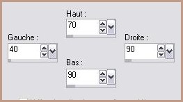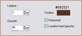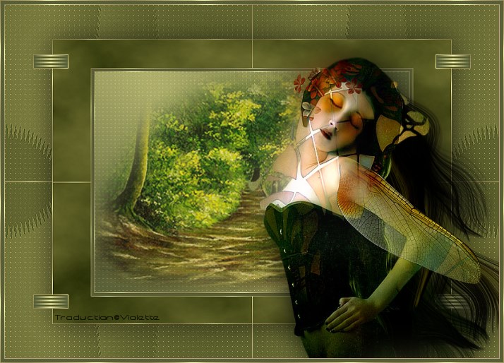 68 - Dans la Palette des Calques dupliquer 69 - Réglages/Flou/Flou gaussien : rayon : 20 70 - Calques/Agencer/Déplacer vers le bas 71 - Calques/Fusionner Tout 72 - Sélection/Sélectionner Tout73 - Image/Ajouter des bordures : 1 pixel couleur contrastante 74 - Sélection/Inverser 75 - Placer un motif or en avant-plan/Remplir votre sélection 76 - Sélection/Sélectionner Tout77 - Image/Ajouter des bordures : 5 pixels couleur #583321 78 - Sélection/Sélectionner Tout 79 - Image/Ajouter des bordures : 1 pixel couleur contrastante 80 - Sélection/Inverser 81 - Placer un motif or en avant-plan/Remplir votre sélection 82 - Sélection/Désélectionner 83 - Réglages/Luminosité et Contraste/Clarifier: 2 84 - Exporter en JPEG Optimisé