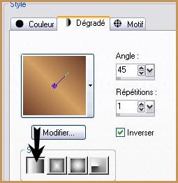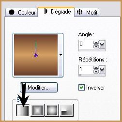 *** 1 - Ouvrir une image de 700 x 500 pixels 2 - Placer en avant-plan la couleur #d4a063 3 - En arrière-plan la couleur #693c2b 4 - Configurer un dégradé linéaire angle:45°/Répétition: 1/Inverser coché