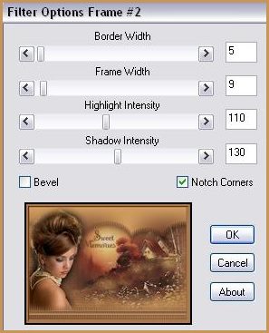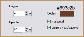 54 - Sélections/Sélectionner Tout 55 - Image/Ajouter des bordures : 8 pixels couleur #693c2b 56 - Sélection/Inverser 57 - Effets/Filtre Graphic Plus/Cross Shadow réglages prédéfnis 58 - Sélection/Sélectionner Tout 59 - Image/Ajouter des bordures : 15 pixels couleur #d4a063 60 - Sélection/Inverser 61 - Effets/Effets de Textures/Stores répéter les n° 51 et 52 62 - Effets/Filtre Bordermania /Frame #2 ( voir n° 53 ) 63 - Sélections/Désélectionner 64 - Image/Ajouter des bordures : 1 pixel couleur #693c2b 65 - Réglages/Luminosité et Contraste/Clarifier : intensité à 2 66 - Exporter en JPEG Optimisé