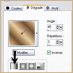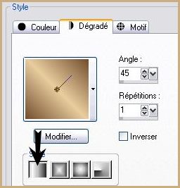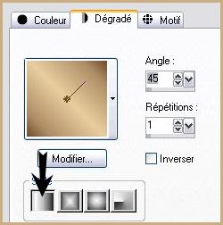 *** 1 - Ouvrir une image de 700 x 500 pixels 2 - Placer en avant-plan la couleur #744d2e 3 - En arrière-plan la couleur #e8cd9e 4 - Configurer un dégradé linéaire angle: 0°/Répétition: 0/Inverser coché