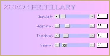 5 - Remplir avec le gradient 6 - Réglages/Flou/Flou gaussien : rayon : 30 7 - Placer votre motif LWood en premier-plan : angle : 0/ échelle: 250 8 - Calques/NOUVEAU CALQUE 9 - remplir de motif 10 - Opacité entre 60/70° 11 - Calques/Fusionner les calques visibles 12 - Calques/Dupliquer 13 - Occulter le calque supérieur et activer le calque du fond 14 - Effets/Filtre xero/Fritillary avec ces réglages