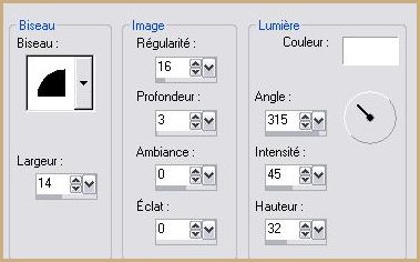 30 - Remplir votre sélection de dégradé 31 - Effets/Filtre xero/Fritillary avec les réglages du n°1332 - Effets/Effets 3D/Biseautage Intérieur :