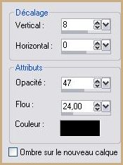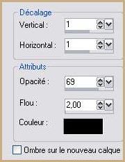 33 - Sélections/Désélectionner 34 - Image/Ajouter des bordures : 1 pixel couleur noire 35 - Edition/Copier 36 - Revenir sur image 700 x 500 pixels mise de côté/ Edition/Coller comme nouveau calque 37 - Effets/Effets 3D/Ombre Portée :