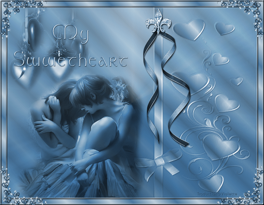 Entrer le texte : My Sweetheart Calques/Convertir en calque raster Réglages/Teinte et Saturation/Coloriser ( réglages précédents ) si vous le souhaitez Effets/Filtre Personnalisé : Emboss_3 Faire une Ombre Portée à votre goût