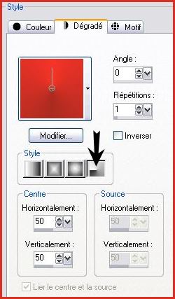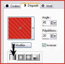 2 - Placer en avant-plan la couleur #f63428 et en arrière-plan la couleur #ab2b20Configurer un dégradé linéaire/angle : 43°/ Répétition: 1