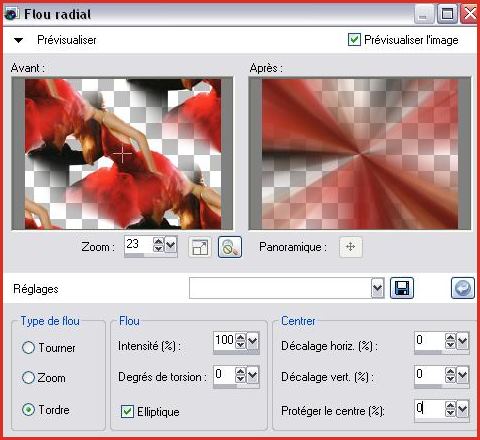 Edition/Copier/Edition/Coller dans la sélectionSélection/Désélectionner 6 - Effets/Effets d'image/Mosaïque sans jointure réglages par défaut 7 - Réglages/Flou/Flou radial avec ces réglages :