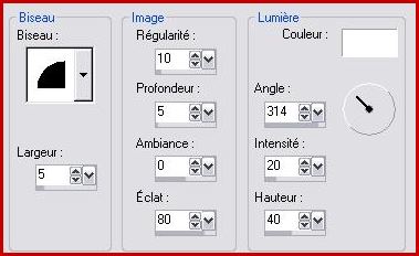 15 - Image/Ajouter des bordures : 5 pixels couleur noireSélection/Sélectionner Tout Sélection/modifier/Contracter de 5 pixels Sélection/Inverser Remplir de dégradé linéaire ( réglages précédents ) Effets/Effets 3D/Biseautage Intérieur : réglages précédents Sélection/Désélectionner