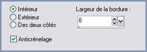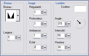 16 - Ouvrir le calque du fond Sélection/Sélectionner Tout Sélection/modifier/Contracter de 12 pixels Sélection/Inverser Calques/Nouveau calque Remplir la sélection du dégradé précédent Effets/Effets 3D/Biseautage Intérieur réglages précédents Sélection/Désélectionner