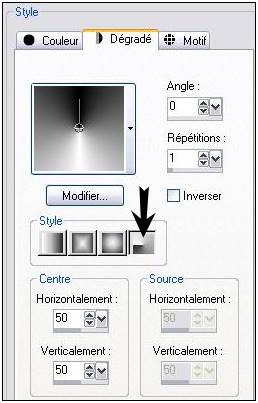 2 - Placer en avant-plan la couleur #000000 et en arrière-plan la couleur #fffffffConfigurer un dégradé radial /angle : 0°/ Répétition: 1