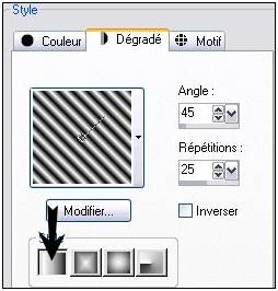 Changez les réglages du dégradé pour un dégradé linéaire /angle : 45°/ Répétitions: 25