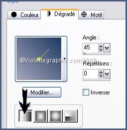 2 - Placer en avant-plan la couleur #a6a6bc et en arrière-plan la couleur #1e3861 Configurer un dégradé linéaire angle: 45°/Répétition: 0