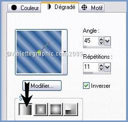 2 - Placer en avant-plan la couleur #98adca et en arrière-plan la couleur #2a5b96 Configurer un dégradé linéaire/angle: 45°/Répétitions: 11/Inverser coché