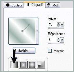 2 - Placer en avant-plan la couleur #ffffff et en arrière-plan la couleur #9db3ac Configurer un dégradé linéaire/angle: 45°/Répétitions: 3