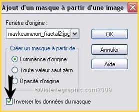 8 - Activer le masque " maskcameron-fractal2 .jpg" Calques/Nouveau calque de masque/à partir d'une image/Ajout d'un masque à partir d'une image sélectionner le masque "maskcameron-fractal2 .jpg" cocher luminance d'origine /cocher inverser les données du masque