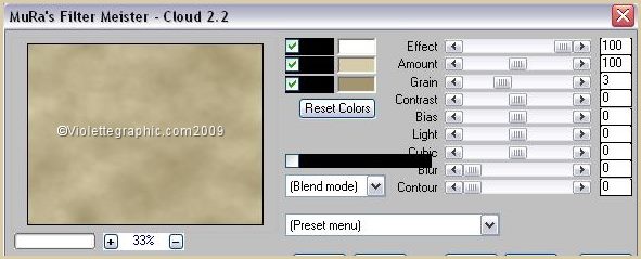 14 - Image/Ajouter des bordures : 41 pixels couleur #a2956f Sélection/Sélectionner Tout Sélection/modifier/Contracter de 40 pixels Sélection/Inverser remplir de dégradé case inverser cochée Effets/filtre Mura's Meister/cloud réglages du n° 5