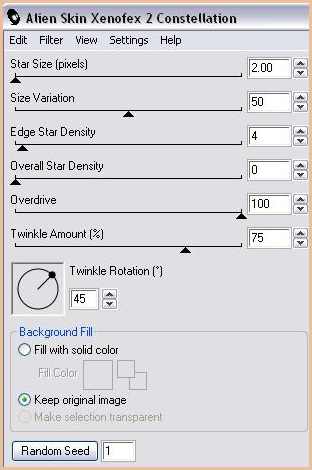 29 - Retourner dans votre PSP 30 - Annuler 2 fois 31 - Effets/filtre Alien Skin Xenofex 2/Constellation : clic sur Random Seed32 - Sélection/Désélectionner Edition/Copier