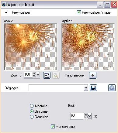 26 - Retourner dans votre PSP Revenir en arrière Activer le calque du feu 27 - Réglages/Ajouter du bruit/Ajouter du bruit : 100 sélection/Désélectionner Ouvrir tous vos calques Fusionner Tout Edition/Copier