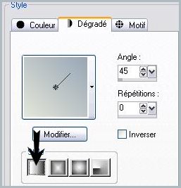 2 - Placer en avant-plan la couleur #e3e7d9 et en arrière-plan la couleur #97a5b5 Configurer un dégradé linéaire/angle: 45°/Répétition: 0