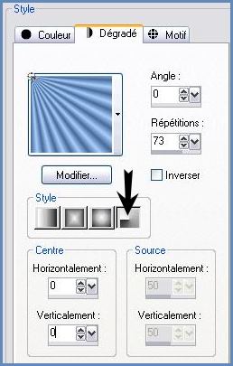 2 - Placer en avant-plan la couleur #a8cefb et en arrière-plan la couleur #45699b Configurer un dégradé radial/ angle: 0°/Répétitions: 73
