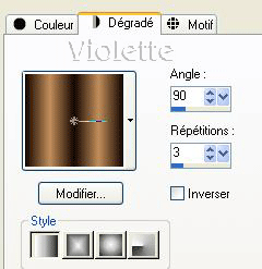 1 - Installer les filtres, la sélection dans les dossiers correspondants de Mes Fichiers PSP Installer la Police dans le dossier Font Ouvrir les tubes/les dupliquer/Fermer les originaux 2 – Configurer en avant-plan le dégradé linéaire angle 90°, répétition : 3, case inverser non cochée