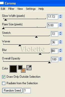 6 – Activer le tube misted Ann160806 /Edition/Copier/ Edition/Coller comme nouveau calque Placer sur le côté gauche 7 – Calques/Nouveau calque 8 – Sélection/Charger/Enregistrer une sélection/Charger à partir du disque /Sélection ann_sel001_vic_TD remplir de couleur #160600 Désélectionner Opacité à 50% 9 – Effets/Eye Candy 4000/Corona :