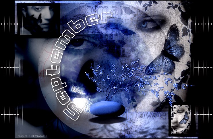 21 - calques/Dupliquer Mode de calque: Obscurcir 22 - Ouvrir l'image Setpember01.jpg 23 - Image/Redimensionner à 100 pixels de hauteur 24 - Image/Ajouter des bordures : 10 pixels couleur noire 25 - Edition/Copier 26- Revenir sur travail/ Edition/Coller comme nouveau calque Placer dans la inférieure droite 27 - Ouvrir l'image Setpember02.jpg 28 - Image/Redimensionner à 100 pixels de hauteur 29 - Image/Ajouter des bordures : 10 pixels couleur noire 30 - Edition/Copier 31- Revenir sur travail/ Edition/Coller comme nouveau calque Placer dans la partie supérieure gauche