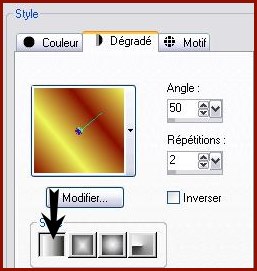*** 1 - Ouvrir une image de 640 x 480 pixels 2 - Placer en avant-plan la couleur #881100 3 - En arrière-plan la couleur #ffe75a 4 - Configurer un dégradé linéaire angle: 50°/Répétitions: 2