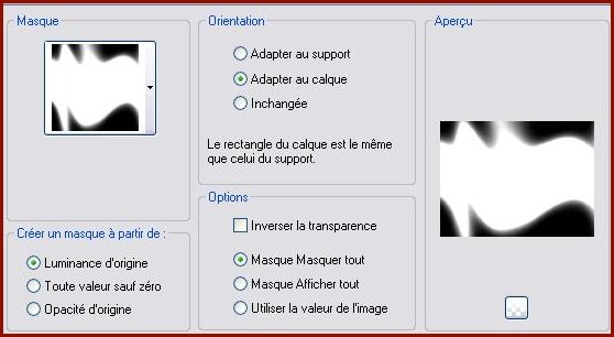 5 - Remplir avec le gradient 6 - Réglages/Flou/Flou gaussien : rayon : 20 7 -Activer l'image the africa_image00image = dimensions (640 x 480 pixels) 8 - Calques/Charger/Enregistrer un masque/Charger à partir du disque/Choisir le masque dmsk0083.jpg