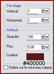 42 - Effets/Effets 3D/Ombre Portée : 2/2/100/5/couleur #400000 43 - Calques/Fusionner Tout 44 - Exporter en JPEG Optimisé