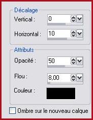 10 - Calques/NOUVEAU CALQUE 11 - Remplir de couleur #ffffff Opacité à 84% 12 - Image/Ajouter des bordures : 1 pixel couleur #000000 13 - Calques/Dupliquer 14 - Image/Redimensionner à 50%/décocher " tous les calques"15 - Effets/Effets d'image/Mosaïque sans jointure réglages précédents 16 - Effets/Effets 3D/Ombre Portée :