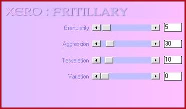 17 - De nouveau activer le tube flower 18 - Edition/Copier 19 - Edition/Coller comme nouveau calque 20 - Placer sur le côté gauche 21 - Calques/Dupliquer 22 - Activer le calque original 23 - Réglages/Flou/Flou gaussien : rayon : 30 24 - Calques/Fusionner les calques visibles 25 - Effets/Xero/Fritillary avec ces réglages :