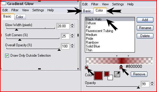 9 - Calques/NOUVEAU CALQUE 10 - Sélection/Sélectionner Tout 11 - Edition/Coller dans la sélection 12 - Sélection/Désélectionner 13 - Placer le mode de calque sur Exclusion 14 - Ouvrir l'image thinredlinesmall.jpg15 - Edition/Copier 16 - Revenir sur votre travail 17 - Edition/Coller comme nouveau calque 18 - Effets/ Filtre Eye Candy 4000/ Gradient glow avec ces réglages: